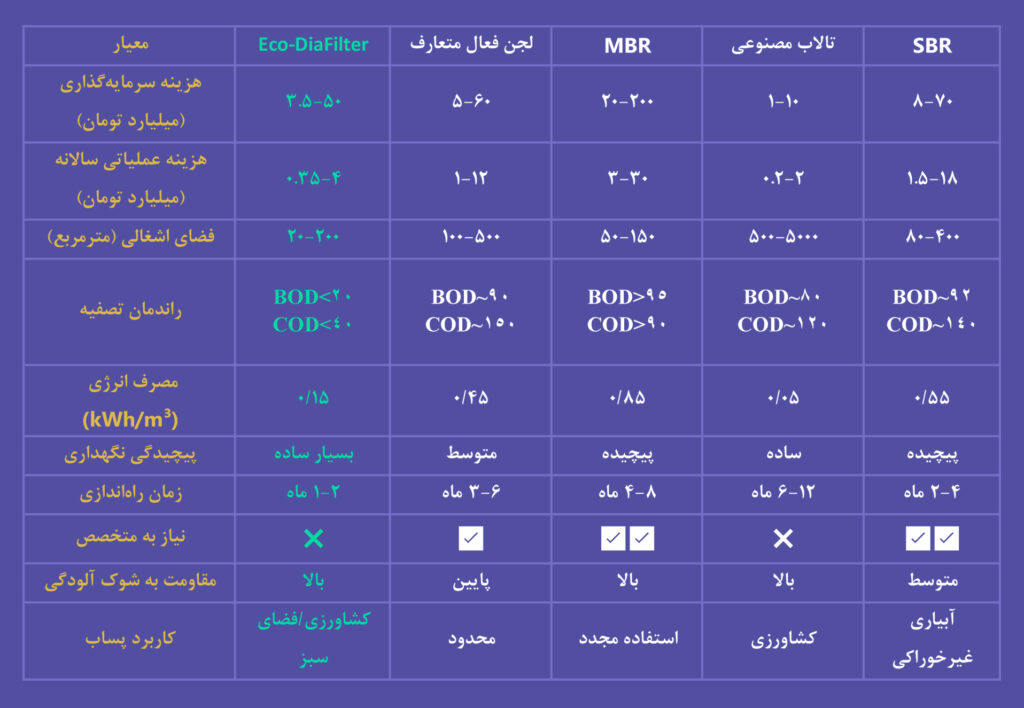 • هزینه عملیاتی سالانه: 70% کمتر از لجن فعال